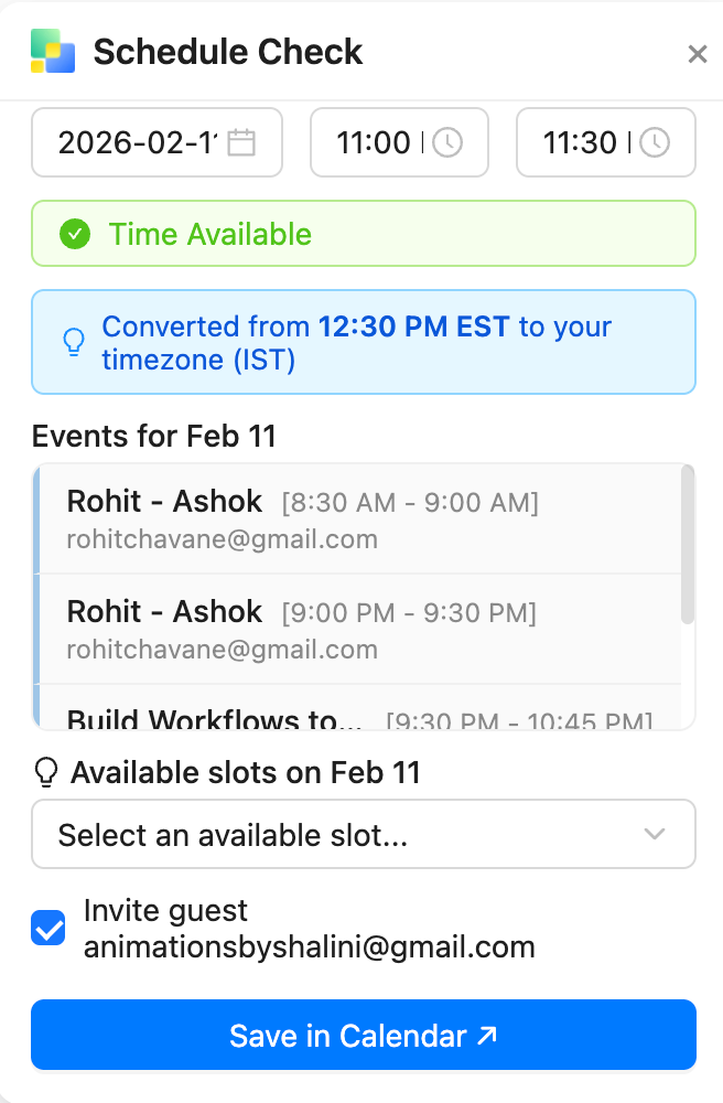 Stop jumping between your calendar, email, and timezone converter just to schedule one meeting.