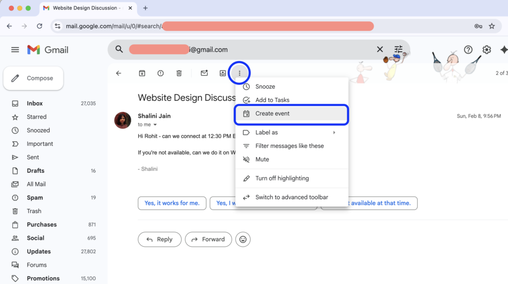 Method 1: Gmail’s “Create Event” via Three Dots Menu